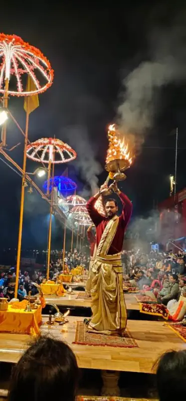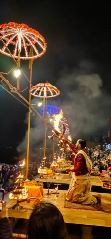 এখন পাশাপাশি অনেকগুলি ঘাটেই গঙ্গা-আরতী হয় বলে দর্শনার্থীদের ভিড় যথেষ্ট শৃঙ্খলিত। একেবারে সামনেই বসার জায়গা পেলাম । ঘাট তীর্থযাত্রী,বিদেশি ও চিত্রগ্রাহক এ ছয়লাপ। ৫ জন ব্রাহ্মণ বৈদিক মন্ত্রোচ্চারণ ও ভজন গানে অপূর্ব ছন্দবদ্ধ আরতী আরম্ভ করলেন। উপস্থিত দর্শনার্থীরাও তাতে যোগ দিলেন। বাতাস ধুপ ,ধুনো ও কর্পূর এর সুগন্ধে ভরে উঠেছে। এমন একটি অনন্য সুন্দর ও আধ্যাত্মিক আবহ সৃষ্টি হল যে শরীর ও মন স্থির ও শান্ত হয়ে যায়। মন্ত্রমুগ্ধের মতো সকলে আরতী দর্শন করলাম। আরতী সমাপ্ত হলেও অত বড় জনসমাগমে কোন কোলাহল হলো না। সকলেই তখন আধ্যাত্মিকতার গভীর প্রশান্তিতে আচ্ছন্ন।