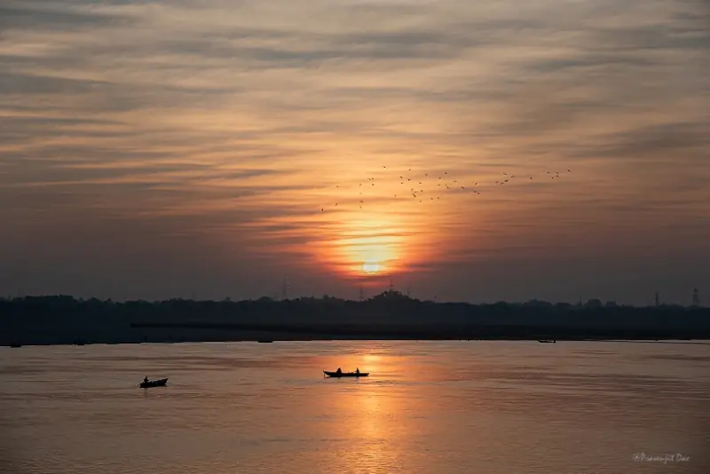 গলি পেরিয়ে পড়ন্ত বিকেলের দোরগোড়ায় সকলে বেশ বড় একখানি নৌকা নিয়ে গঙ্গায় ভেসে পড়লাম। গঙ্গায় নৌবিহার বেনারস ভ্রমণের অচ্ছেদ্য অঙ্গ। দূর থেকে পুরো বেনারস দেখতে দেখতে অদ্ভুত অনুভূতি হল। মনে হল যেন সহস্রাব্দ পেরিয়ে সুদূর অতীতে পৌছে গেছি কোন এক অজানা টাইম মেশিনে চড়ে