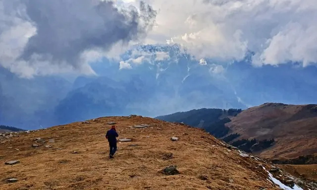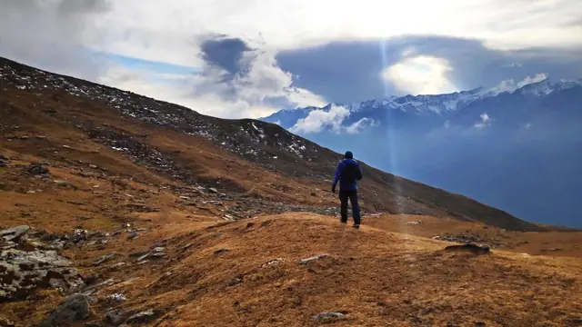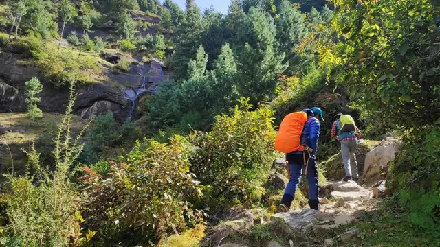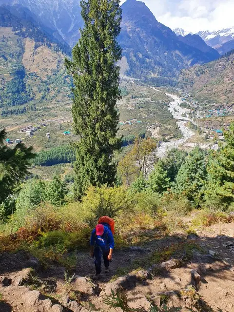 কুলাং আনুমানিক ৬৬০০ ফুট উপরে অবস্থিত। প্রথমে কিছু ঘরবাড়ি, তারপর বাগান, তারপরই শুরু হয়ে যায় বিশাল পাহাড়ের পাহাড়ি পাথুরে পথ। যতই উপরে উঠছিলাম ছোট হয়ে আসছিল দুনিয়া। দূর থেকে ছোট হয়ে আসছিল সোলাং ভ্যালী সহ আশপাশ। আনুমানিক ৩-৩.৩০ ঘন্টা খাড়া উপরের দিক উঠার পর পাওয়া যায় কিছুটা সমান রাস্তা। আস্তে আস্তে নিঝুম হয়ে যাচ্ছিল পরিবেশ, নিজেদের হাঁটার শব্দ বাদে কিছুই নাই মনে হচ্ছিল। ঘন জঙ্গলের মাঝে শুকনা পাতার শব্দ, মাঝে মাঝে মাঝারী কিছু ঝর্ণার গান তাড়িয়ে দিচ্ছিল সব ক্লান্তি।