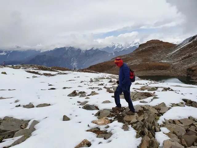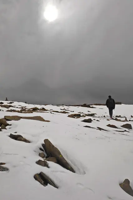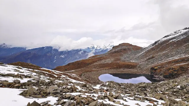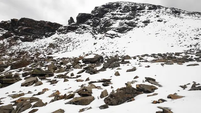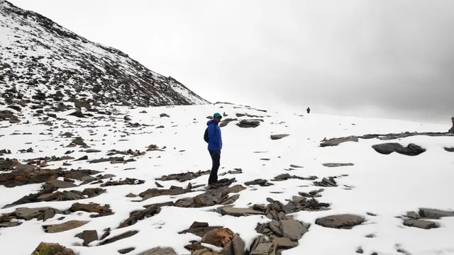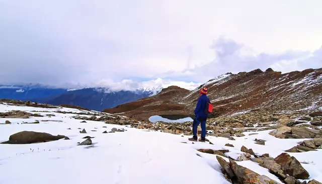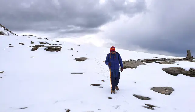 একটু বিশ্রাম এবং দুপুরের খাবার খেয়ে আবার রওনা দিলাম। ততক্ষণে দূরের হনুমান টিব্বা পাহাড়ের চূড়া ঢেকে গিয়েছিল ঘন মেঘে। দ্রুত আবহাওয়া পরিবর্তনের ভয় এবং গাইডের সেই মহৎ বানী “এই যে সামনে পাহাড়ের পরেই”; শুনে শুনে এগুতে থাকি ক্লান্ত শরীরে হেলে দুলে। ইতিমধ্যে আমরা ঢুকে পড়ি সাদা বরফের রাজ্যে। বড় বড় পাথরের মাঝে মাঝে বরফ পরে সমান একটা রাস্তার রূপ দিলেও ছিল প্রচুর বিপদজনক। দুই পাথরের মাঝে পা পরতেই পা ঢুকে যাচ্ছিল বরফের মাঝে। আস্তে আস্তে দেখে শুনে এগুতে থাকি আমরা। এর মাঝেই আবহাওয়া অনাকাঙ্ক্ষিতভাবে ভয়াবহ হয়ে উঠে। বাতাসের বেগ বেড়ে যায় দ্বিগুণ, মেঘের ভেলাটা এসে পরে আমাদের কাছেই। প্রতিটা বড় বড় চড়াই পার হয়েই মনে হচ্ছিল যে এখনই বুঝি চোখের সামনে দেখব আমাদের লক্ষ্যটা। কয়েকবার ধোকা খাওয়ার পর অবশেষে দেখা পাওয়া তাহার। দেখেই শরীর ছেড়ে দিতে চাইছিল, মনে হচ্ছিল কেও কানে এসে বলছে “চলে এসেছিস, এবার একটু ঘুমা”।